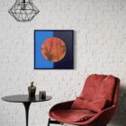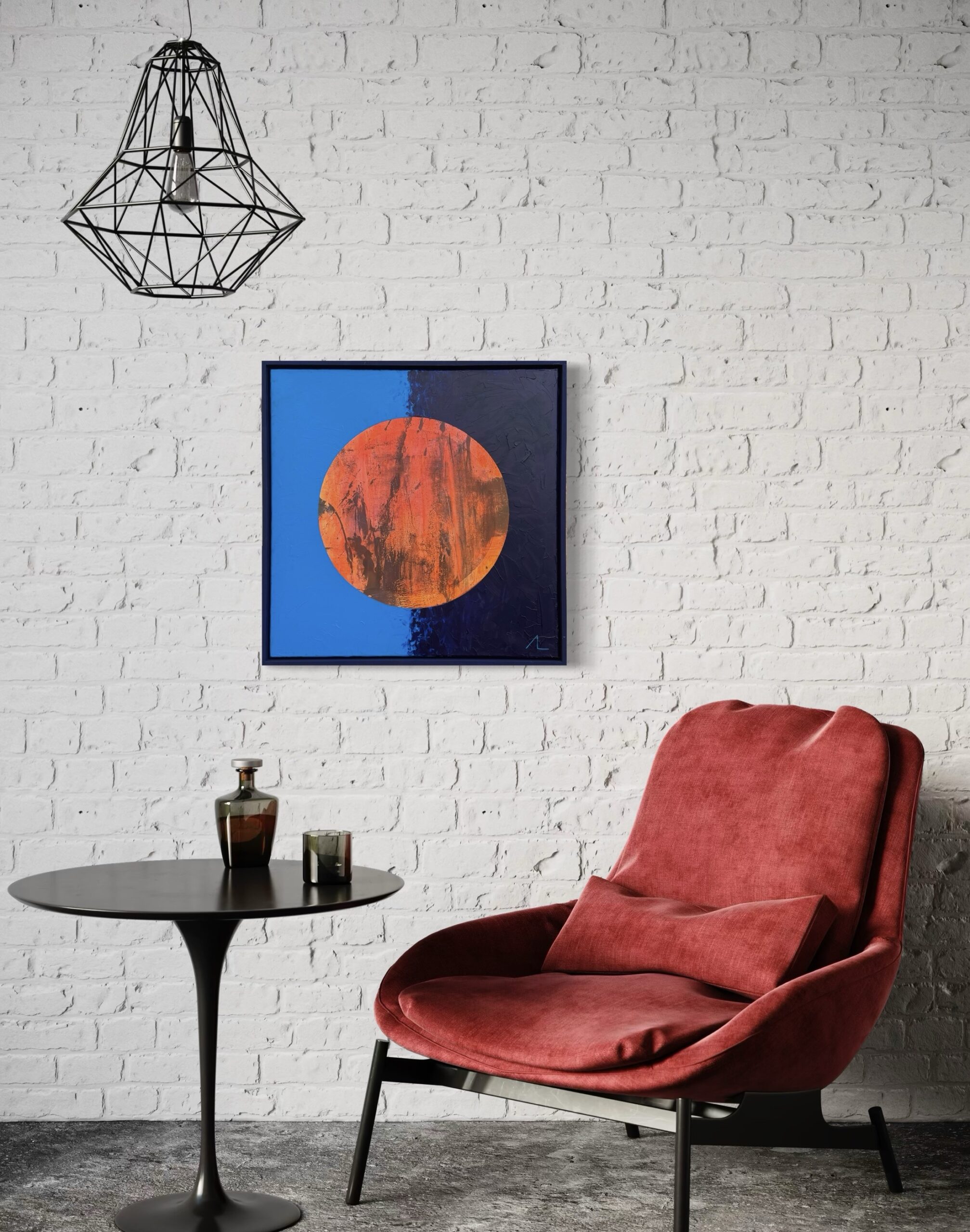 Der Hintergrund ist zweigeteilt. Links ein klares, kräftiges Ultramarinblau, rechts ein tiefes, fast schwarz wirkendes Dunkelblau. Die klare Trennung der Farbflächen betont die Zentralität des Kreises und suggeriert Polarität: Tag und Nacht, Erde und Kosmos, Materie und Energie. Gerade durch diese formale Reduktion wirkt das Werk äußerst kraftvoll – jedes Element ist bewusst gesetzt und in sich stimmig.