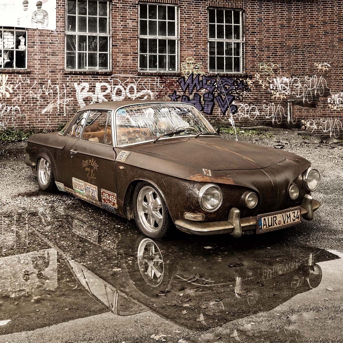 Mit „Maltes Karmann Spiegelbild“ gelingt Ansgar Wilkendorf eine beeindruckende Hommage an die automobile Kultur der 1960er Jahre. Das Werk zeigt einen VW Karmann Ghia Typ 34, der in einer urbanen Szenerie zwischen Rost, Regen und Reflexionen inszeniert wird. Der Künstler verbindet hier die Präzision moderner Fototechnik mit der Ästhetik des Vergehens – ein Spiel zwischen Glanz und Patina, Vergangenheit und Gegenwart.