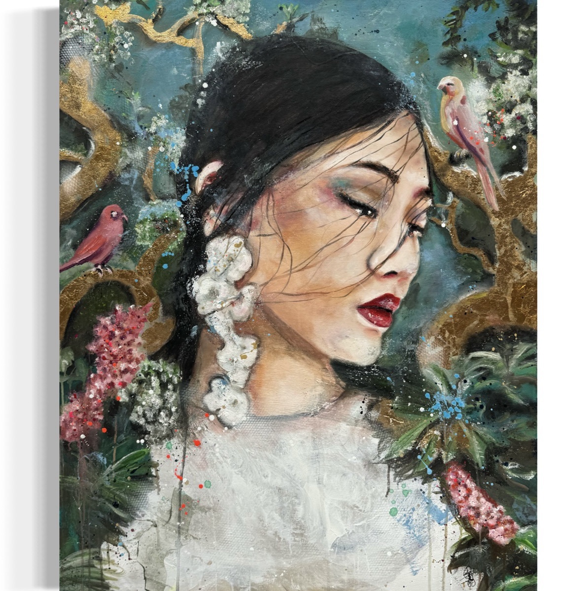 Das Werk „Matcha Garden“ von Astrid Stöfhas ist eine figurative Arbeit in Öl, Blattgold und Mischtechnik auf Leinwand. Das Bild im Format 80 × 100 cm ist ein signiertes Unikat und verbindet Porträtmalerei mit dekorativen Naturmotiven und strukturierten Oberflächen.