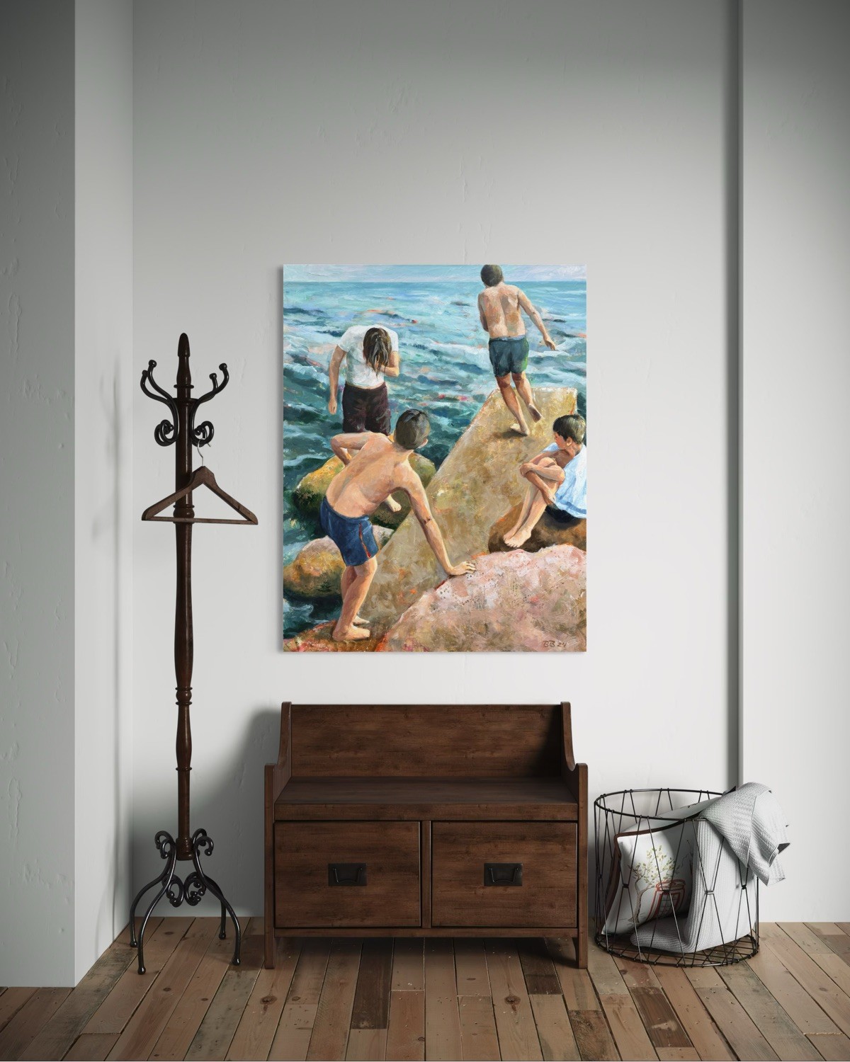 Im Zentrum des Bildes steht eine dreieckig zulaufende Steinplatte, die diagonal ins Wasser ragt und dem Bild eine deutliche Raumtiefe verleiht. Zwei Jungen befinden sich auf dieser Fläche – einer sitzt seitlich am Rand, ein anderer steht im Begriff, ins Wasser zu springen. Links im Vordergrund stützt sich eine weitere Figur auf einem Felsen ab, während im Hintergrund ein Kind bereits im Wasser steht. Die Körperhaltungen wirken natürlich und ungezwungen, die Bewegungen sind momenthaft eingefangen.