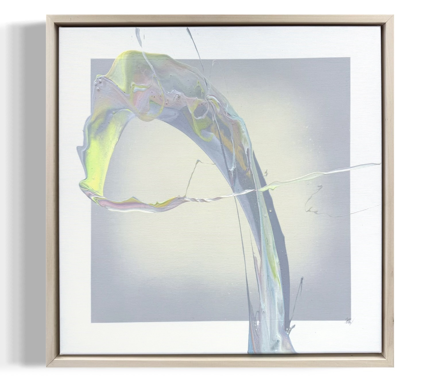 Mit „Grey Dream“ setzt Cevin Parker seine unverkennbare Bildsprache fort: Farbdynamik trifft auf meditative Stille. In diesem 50 × 50 cm großen Unikat entfaltet sich ein irisierender Farbverlauf wie eine schwebende Geste im Raum. Die zentral platzierte, bogenartige Farbform scheint in Bewegung eingefroren zu sein – ein Moment flüchtiger Schönheit, der durch seine schimmernden Gelb-, Grün- und Blautöne lebendig bleibt. Dabei steht die Form im spannungsvollen Kontrast zum weichen, grau-beige getönten Hintergrund, der wie ein diffuser Lichtschein aus dem Zentrum herausstrahlt.