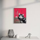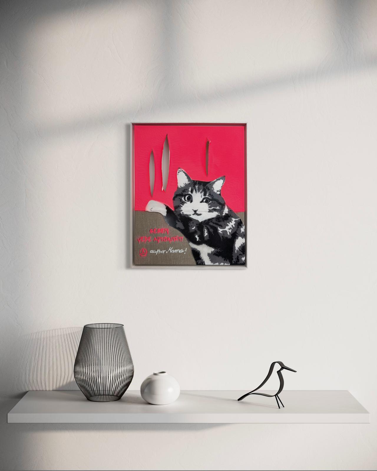 Das Werk „Gegen jede Autorität!“ von Claudia Simon verbindet Elemente der Street Art mit einer klaren, grafischen Bildsprache. Im Zentrum steht die Darstellung einer Katze im Stencil-Stil, ausgeführt in kontrastreichen Schwarz-Weiß-Flächen. Die Figur ist frontal dargestellt und nimmt einen Großteil der Bildfläche ein, wodurch eine unmittelbare visuelle Präsenz entsteht.