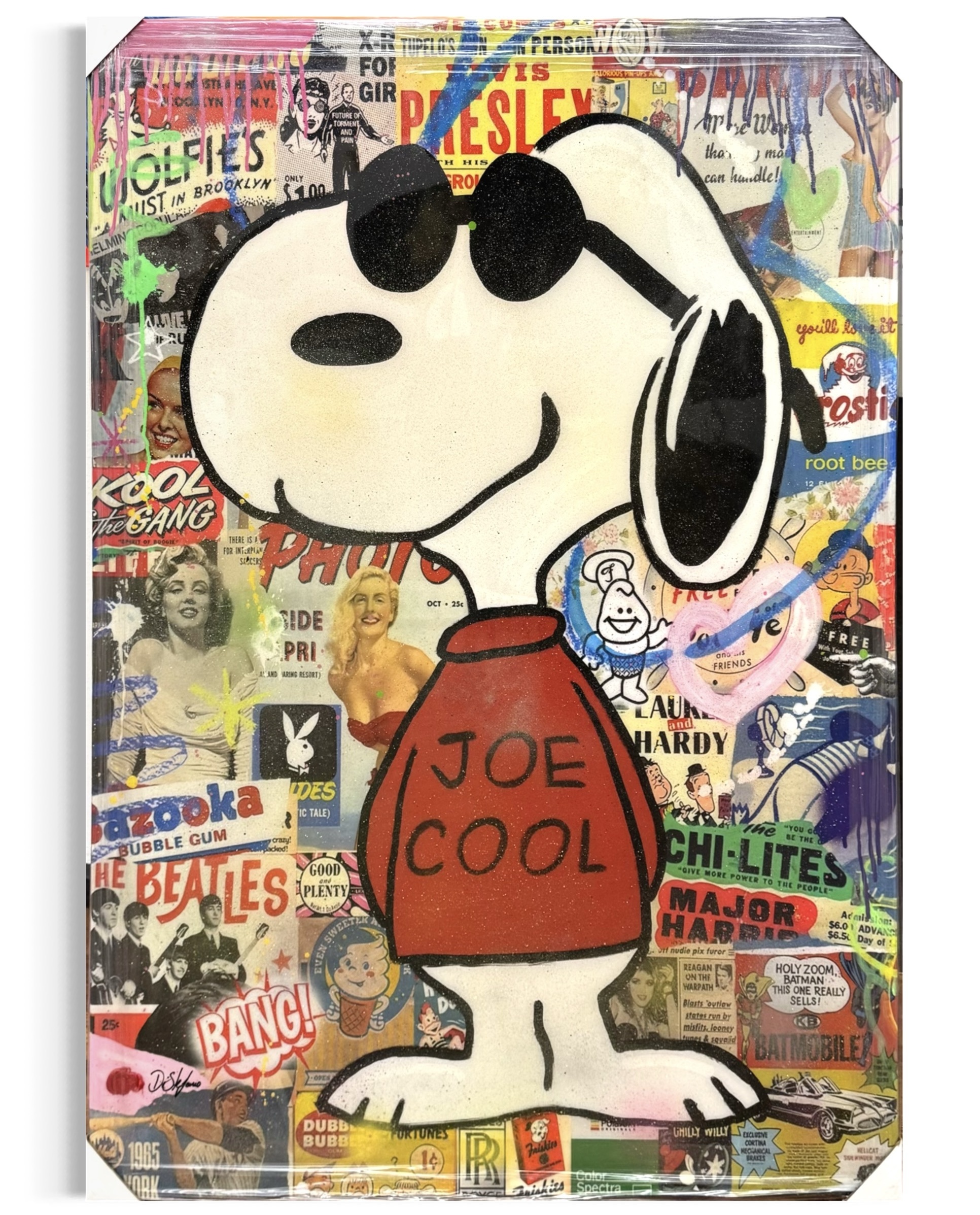 Im Zentrum des Werkes steht die bekannte Comicfigur Snoopy in seiner Rolle als „Joe Cool“. Die Figur wurde in klaren Konturen, bewusst reduzierter Farbpalette und leicht ironischer Pose über das collageartige Setting gelegt. Der Kontrast zwischen der ruhigen, grafisch anmutenden Darstellung und dem dynamischen Hintergrund schafft eine kompositorische Spannung, die typisch für DiStefanos Handschrift ist. Die abschließende Schicht Epoxidharz veredelt die Oberfläche mit einem gläsernen Finish, intensiviert die Farben und verstärkt den dreidimensionalen Eindruck des Werkes. Die Materialtiefe entsteht durch die Kombination aus glossy Harzschichten und den darunterliegenden Collage-Elementen, die an einzelnen Stellen sichtbar hervorblitzen.