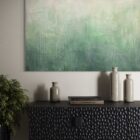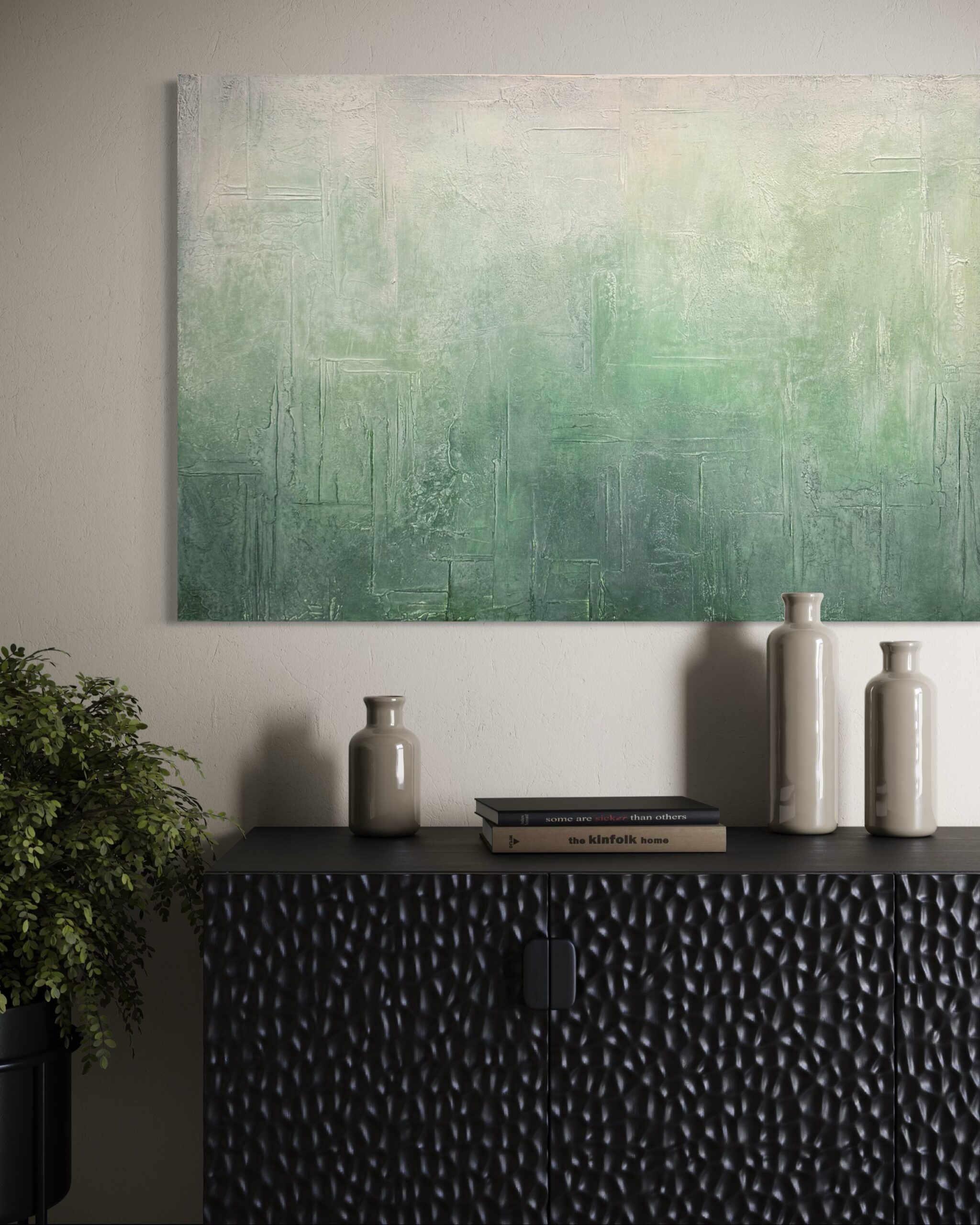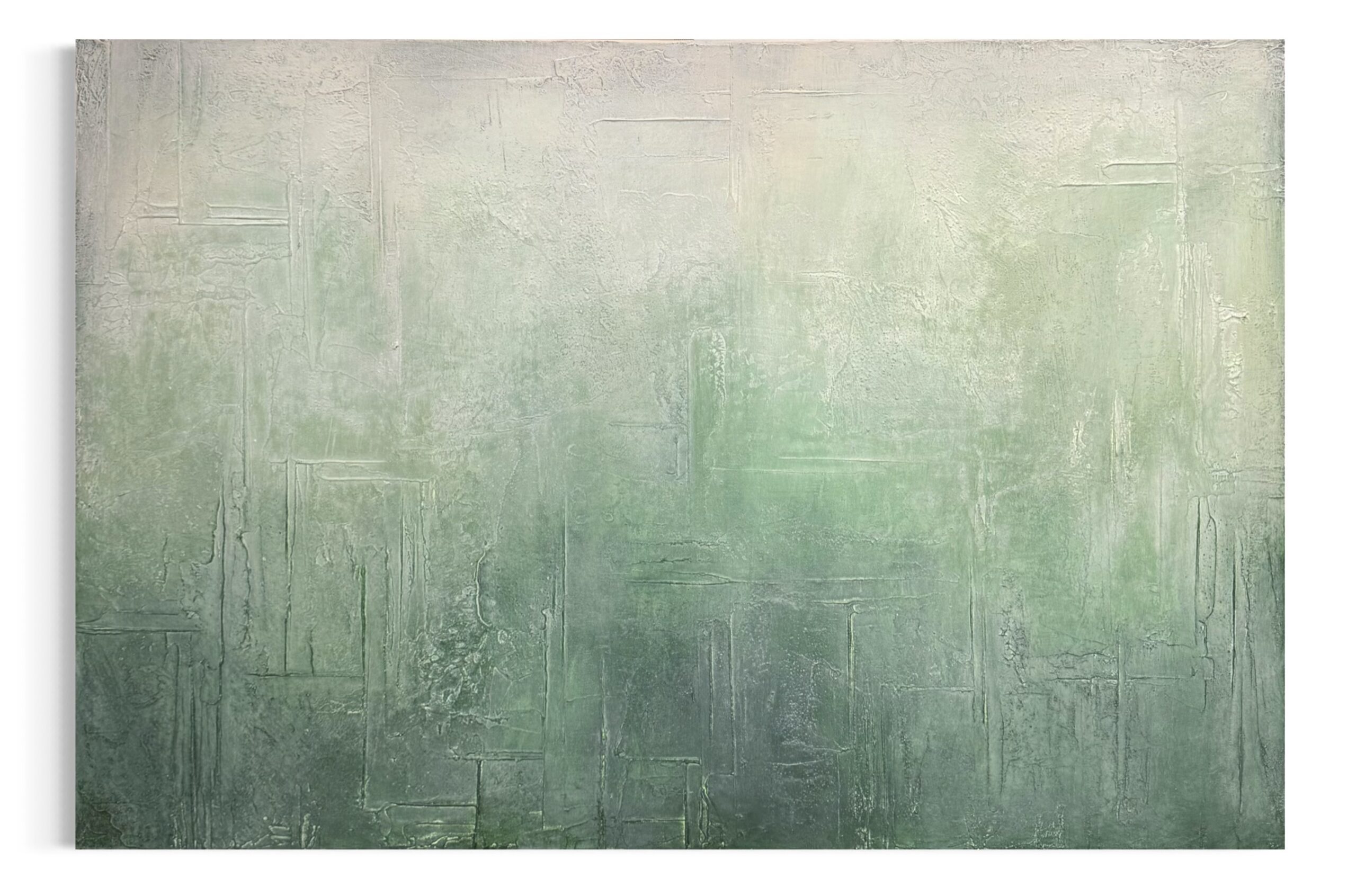 „Kindness matters“ von Fee Gunkel ist ein großformatiges Mixed-Media-Werk, das sich durch seine ruhige, atmosphärische Farbgestaltung und eine vielschichtige Oberflächenstruktur auszeichnet. Die Künstlerin arbeitet mit einer Kombination aus Öl- und Acrylfarben, die in mehreren Schichten aufgetragen werden und so eine sanfte, harmonische Übergangsfläche erzeugen. Dominiert wird das Bild von Grün- und Naturtönen, die von hellen Nuancen begleitet werden und einen weichen Verlauf von oben nach unten bilden.
