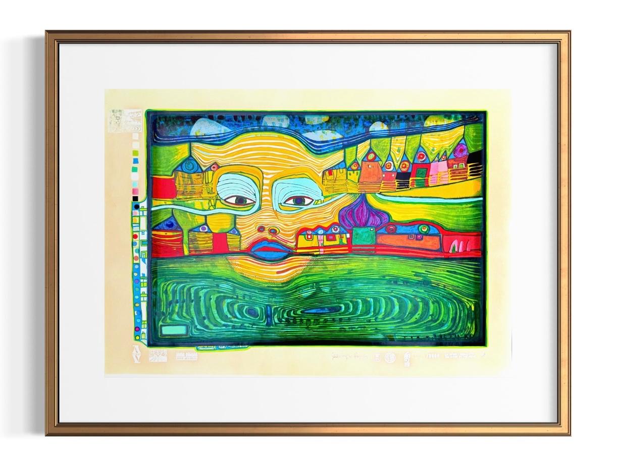 Die Drucksignatur bestätigt die Zugehörigkeit zur autorisierten Edition und unterstreicht den sammlerischen Charakter. Das Werk eignet sich insbesondere für Sammler von Hundertwasser-Grafiken sowie für Räume, in denen farbstarke, grafisch strukturierte Arbeiten gefragt sind.