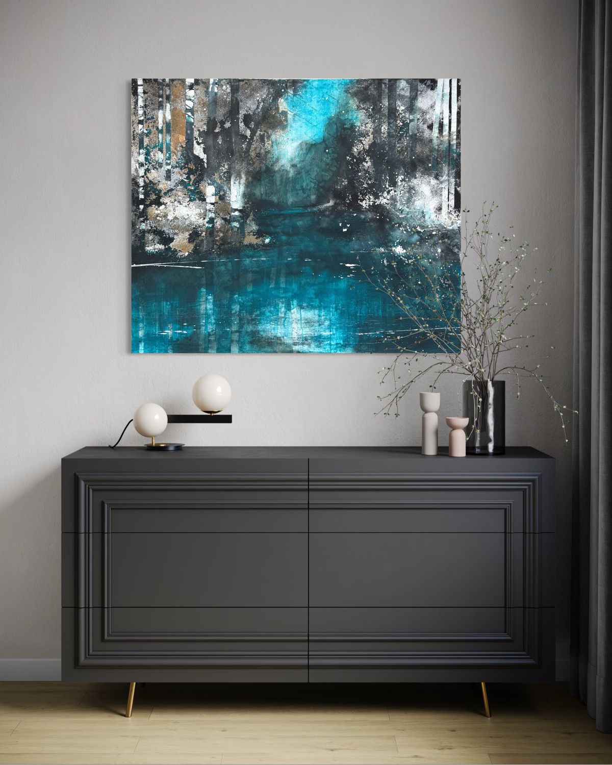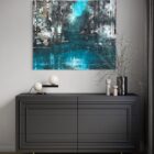 Mit seinem Format von 100 × 120 cm besitzt das handsignierte Unikat eine deutliche Präsenz im Raum. Die Kombination aus ruhiger Wasserfläche, dichter Waldstruktur und vielschichtiger Mischtechnik macht das Werk zu einer ausdrucksstarken Arbeit, die sich sowohl für private Wohnräume als auch für moderne Büro- oder Geschäftsumgebungen eignet.