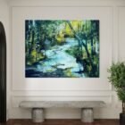 Die Farbpalette bewegt sich überwiegend im Spektrum von Grün-, Blau- und Türkistönen, ergänzt durch helle Gelb- und Lichtakzente im Hintergrund. Diese helleren Partien deuten einfallendes Licht im Wald an und strukturieren die Tiefe der Landschaft. Gleichzeitig sorgen dunklere Bereiche im Vordergrund für einen stabilen Bildaufbau und rahmen die zentrale Wasserfläche.