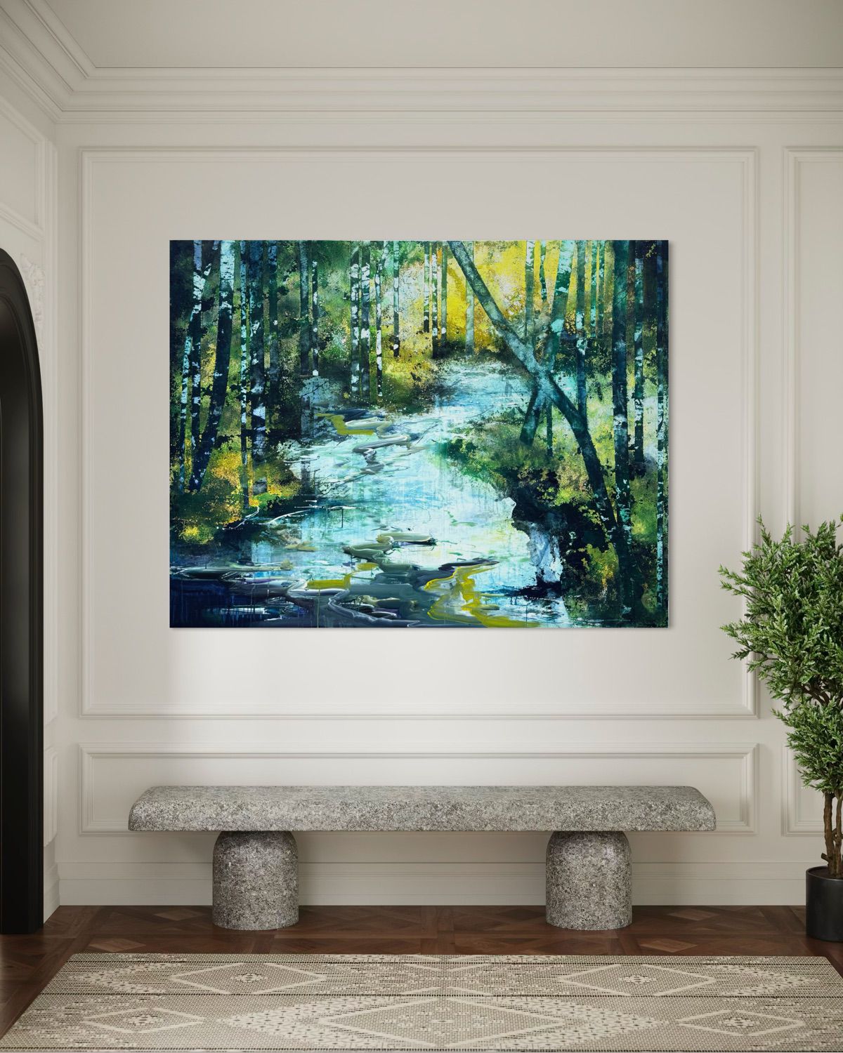 Die Künstlerin arbeitet hier mit einer vielschichtigen Mischtechnik auf Leinwand. Unterschiedliche Farbaufträge, transparente Lasuren sowie gesprühte und gespachtelte Partien überlagern sich und erzeugen eine komplexe Oberfläche. Besonders im Bereich des Wassers sind fließende Farbspuren und verlaufende Linien erkennbar, die dem Bild eine dynamische Struktur verleihen. Diese malerischen Bewegungen bilden einen Kontrast zu den klaren vertikalen Linien der Baumstämme.