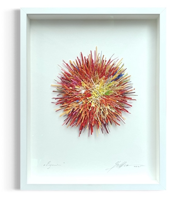 Das 3D-Objekt „Organics“ von Gabriele Mierzwa ist eine handgefertigte Wandarbeit, die aus einer Vielzahl einzeln arrangierter Holzstäbchen besteht. Die Elemente sind radial von einem zentralen Punkt aus angeordnet und bilden eine kompakte, kugelartige Struktur. Durch diese präzise Ausrichtung entsteht eine deutlich plastische Oberfläche, die sich vom Hintergrund abhebt und dem Werk eine starke räumliche Wirkung verleiht.