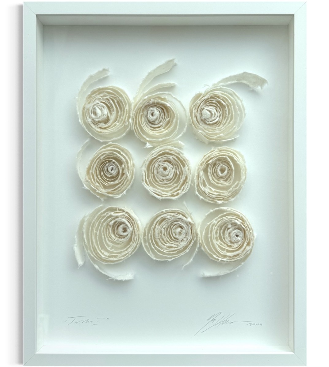 Das 3D-Objekt „Twister II“ von Gabriele Mierzwa ist eine reliefartige Wandarbeit aus gerolltem Material, das in spiralförmigen Strukturen angeordnet ist. Insgesamt neun runde Elemente sind in einer klaren, rasterartigen Komposition angeordnet. Die einzelnen Formen bestehen aus schichtweise aufgerollten Streifen, die zu kompakten Spiralen geformt wurden und dadurch eine deutlich plastische Oberfläche erzeugen.