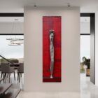 In dem eindrucksvollen Gemeinschaftswerk „Grazie“ verbinden Heinrich Brockmeier und Uschi Klaas malerische Ausdruckskraft mit plastischer Präsenz. Die großformatige Arbeit misst 230 × 65 cm und ist ein Unikat, das durch die Symbiose zweier Kunstformen besticht: Malerei und Skulptur. Der leuchtend rote Bildträger in Öl auf Leinwand wirkt wie ein pulsierender Hintergrund für die zentral platzierte Bronzeapplikation – eine stilisierte, hoch aufragende Frauenfigur, die sich elegant streckt. Die Skulptur scheint aus dem Bild herauszutreten und schafft damit eine faszinierende räumliche Tiefe.