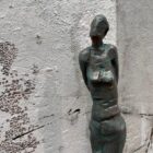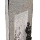 Die Leinwand zeigt eine in neutralen, überwiegend hellen Farbtönen gehaltene Fläche mit strukturierter Oberfläche. Der Bildträger wirkt durch bewusste Spuren, Schichtungen und grafische Elemente wie bearbeitet oder überlagert. Im unteren Drittel ist eine stehende, figürliche Bronzeapplikation angebracht. Die schlanke Figur steht leicht nach hinten versetzt auf einer angedeuteten Sockelzone und tritt reliefartig aus dem Bild hervor.