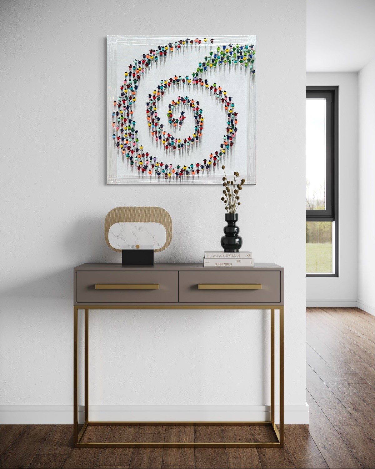 Mit einer Größe von 80 × 80 cm besitzt das Werk ein ausgewogenes Format, das sowohl in privaten Wohnräumen als auch in modernen Büro- oder Empfangsbereichen gut zur Geltung kommt. Die kräftigen Farben der Figuren bilden einen starken Kontrast zum ruhigen Hintergrund und sorgen für eine klare visuelle Präsenz.