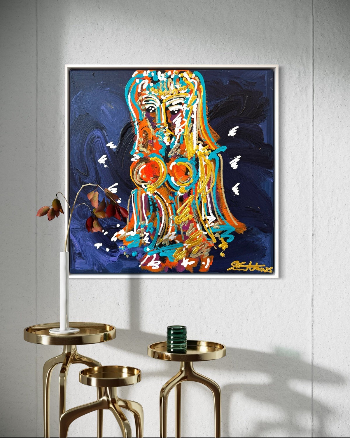 Goldfarbene Linien und Akzente sind in verschiedenen Bereichen der Figur eingesetzt und bilden zusätzliche strukturierende Elemente innerhalb der Komposition. Weiße Linien und kleine Farbtupfer verteilen sich über Figur und Hintergrund.