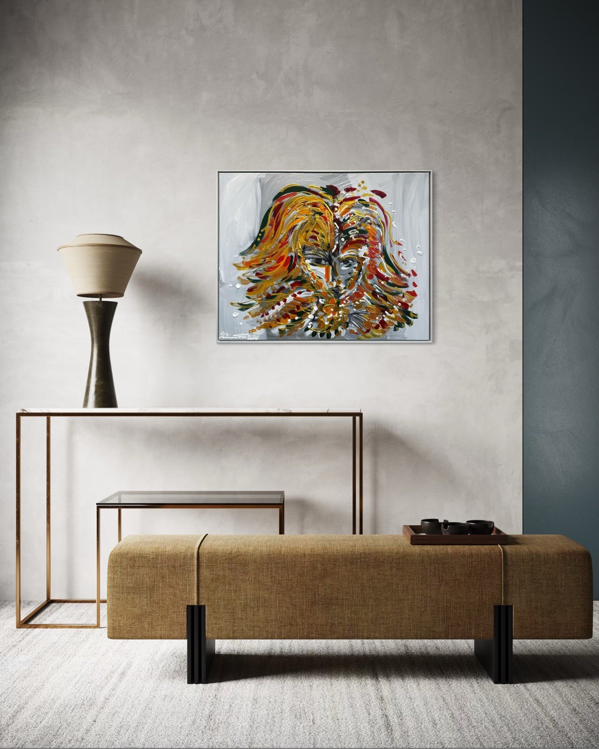 Die Farbpalette umfasst unter anderem Grau, Weiß, Rot, Orange, Grün und Gold. Die Gesichtspartie ist teilweise in Grautönen angelegt, während darüber und daneben dynamische Farbaufträge in warmen Rot-, Orange- und Gelbtönen verlaufen. Zahlreiche Linien und Farbbahnen ziehen sich über Gesicht und Haarpartien und überlagern die darunterliegenden Farbflächen.