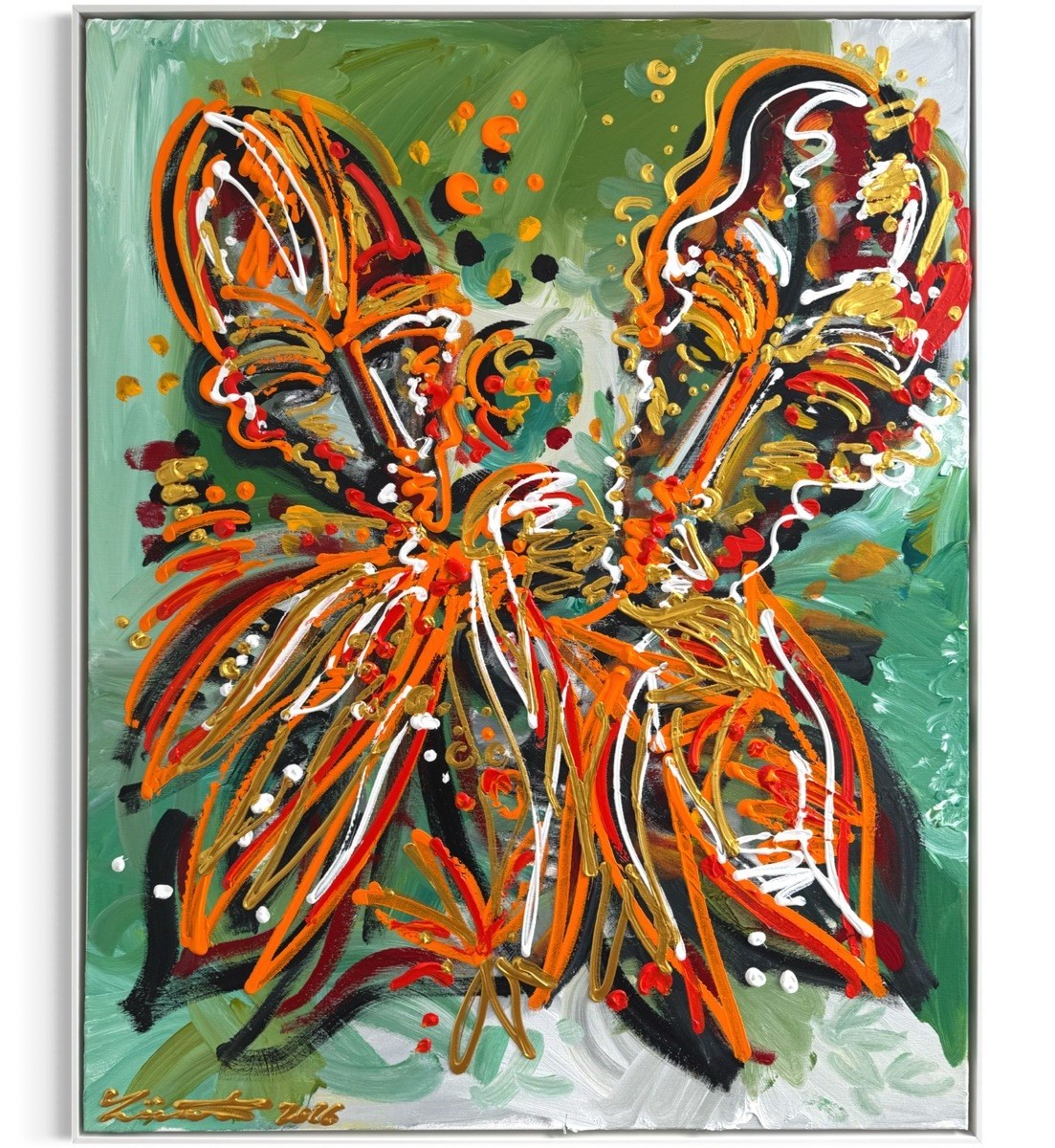 Das Werk ist auf Leinwand ausgeführt, vom Künstler signiert und in einem Rahmen gefasst.