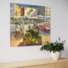 Besonders eindrucksvoll ist die Balance zwischen klar erkennbaren Elementen – wie den roten Stühlen, den Sonnenschirmen oder den Figuren mit Fahrrad – und der malerischen, leicht abstrahierten Farbführung. Die Fassaden in warmen Gelb-, Rot- und Pastelltönen fangen das mediterrane Licht ein und geben dem Werk eine heitere, lebensfrohe Stimmung.
