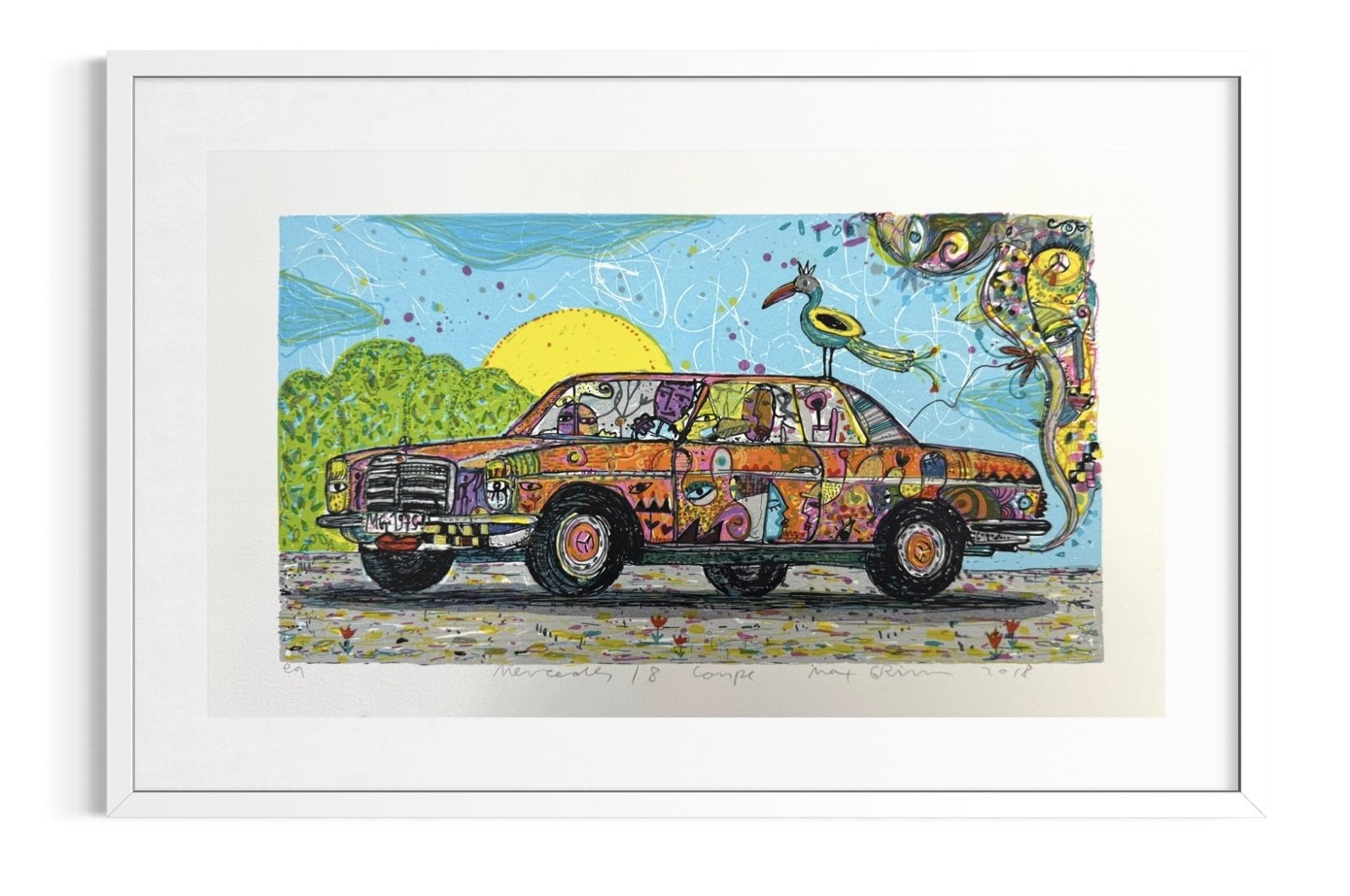 Die Serigrafie „Mercedes /8 Coupé“ von Max Grimm zeigt einen klassischen Mercedes-Benz in Seitenansicht, der durch eine farbenreiche, detailreiche Gestaltung zu einem grafischen Hauptmotiv wird. Das Fahrzeug ist vollständig mit unterschiedlichen Mustern, Ornamenten und kleinen Bildmotiven versehen, wodurch die Karosserie wie eine collageartige Bildfläche wirkt.
