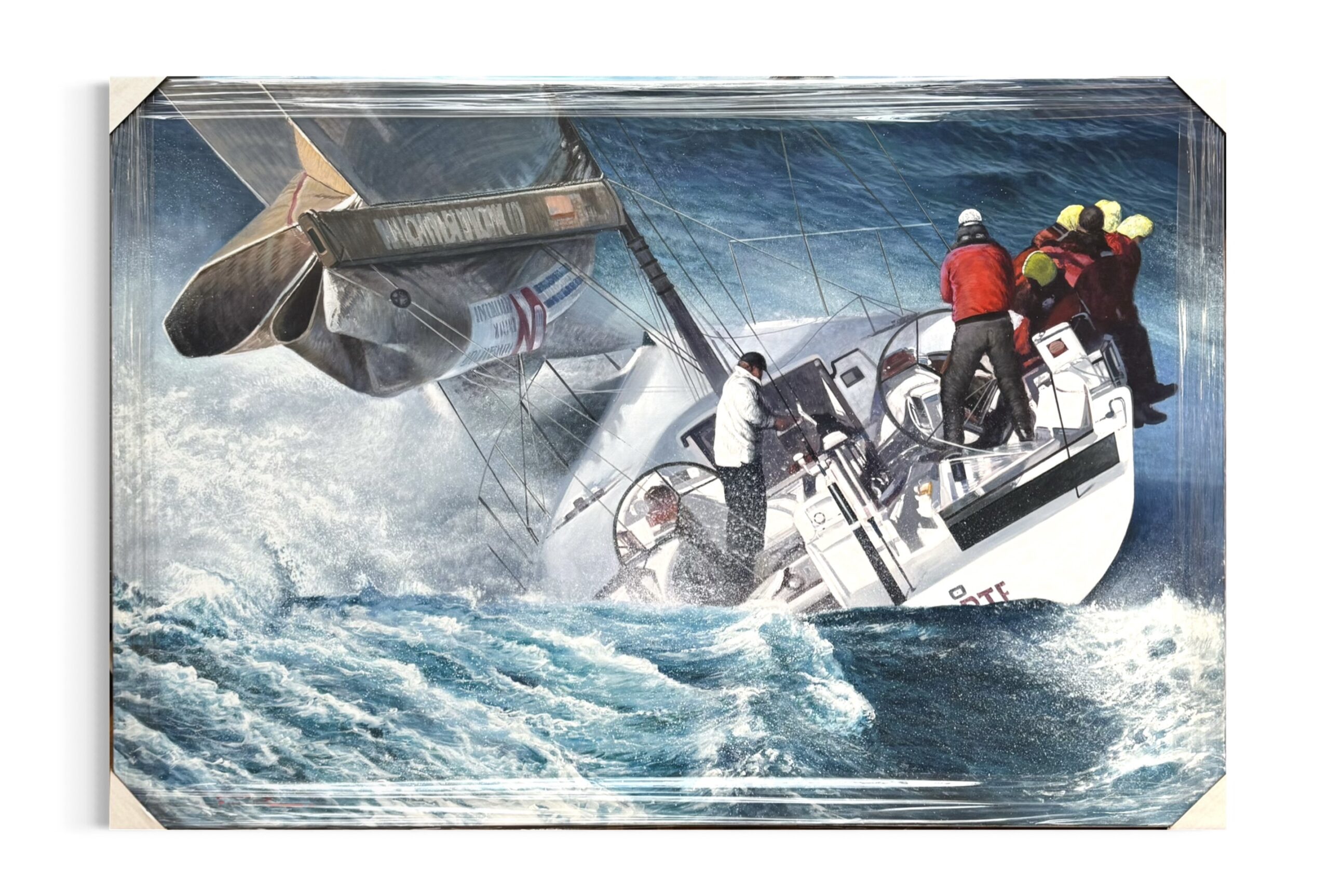 „Segler II“ von Raffaele Fiore ist ein signiertes Unikat, das mit Öl- und Acrylfarben auf einer 100 × 80 cm großen Leinwand ausgeführt wurde. Das Werk zeigt ein Segelboot in dynamischer Schräglage, während die Crew aktiv in das laufende Manöver eingebunden ist. Fiore arbeitet mit einem klar strukturierten Bildaufbau, der die Bewegung des Wassers, die Lage des Bootes und die technische Ausstattung präzise voneinander trennt. Der Vordergrund ist von stark strukturierten Wellen geprägt, die durch Schichtaufbau mit Acrylfarben erzeugt wurden. Öl wird für weichere Übergänge sowie für die detailreichen Partien im Rumpf und den Figuren eingesetzt.