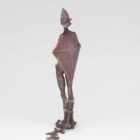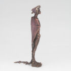 Die Bronze zeigt eine aufrecht stehende, leicht abstrahierte Figur mit einem markanten Kopf und flügelähnlich angedeutetem Rücken. Charakteristisch sind die fein modellierten Details wie Gesicht, Füße und der längliche Schwanz, der sich vom Bein herab zieht und flach auf dem Boden ausläuft. Die Oberfläche ist unregelmäßig patiniert, mit rotbraunen und goldenen Akzenten, die die plastische Wirkung unterstreichen.