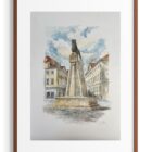 Die Arbeit ist in transparenter Aquarelltechnik ausgeführt. Charakteristisch sind die weich verlaufenden Farbflächen und die sichtbar bleibenden Pinselstrukturen. Die Farbpalette bewegt sich zwischen warmen Ocker-, Beige- und Brauntönen für Gebäude und Sockel sowie kühlen Blau- und Grauabstufungen im Himmel. Diese Kombination erzeugt eine ausgewogene Bildwirkung und verleiht dem Motiv Tiefe.