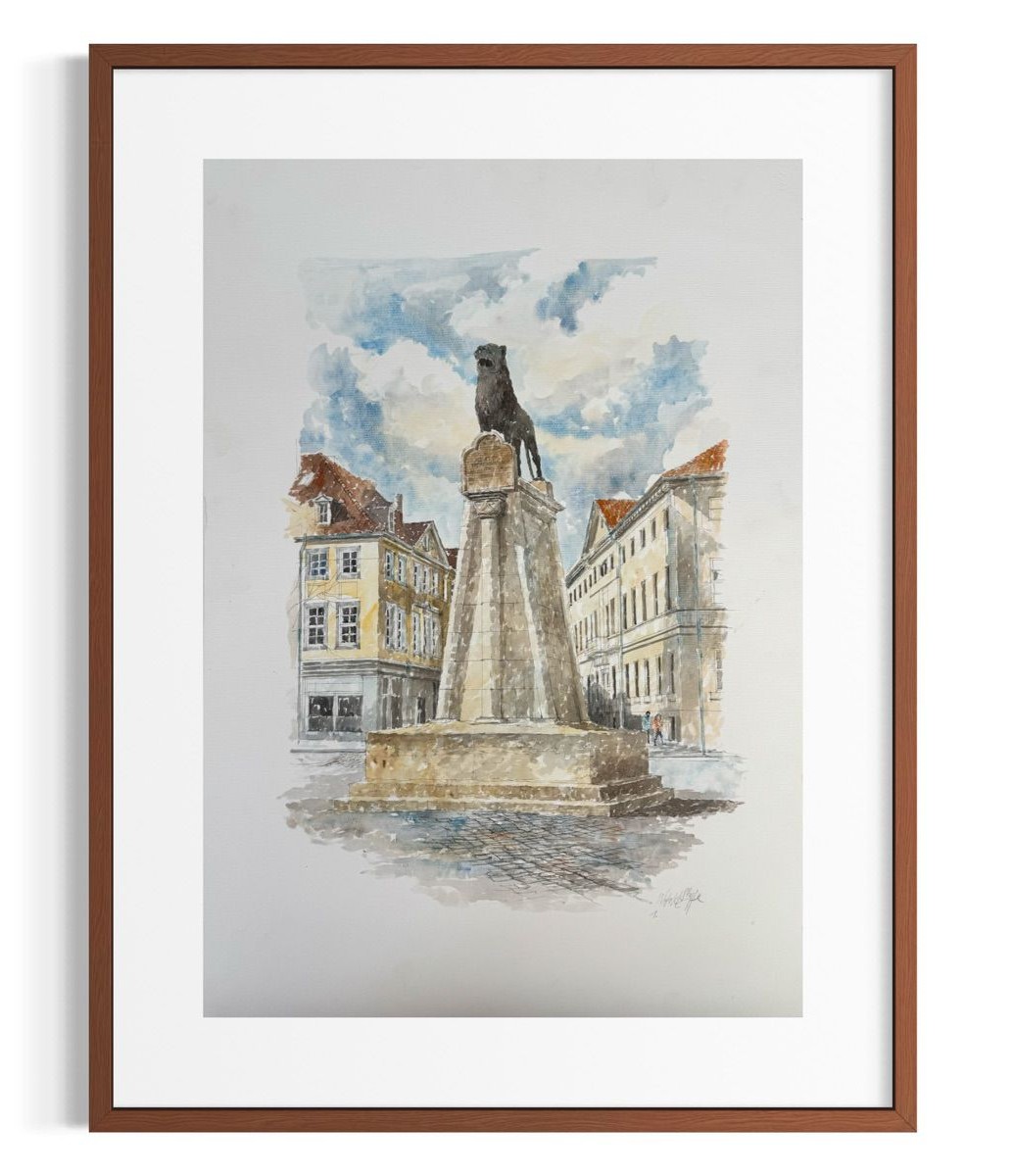 Das Aquarell „Burglöwe“ von Witold Stypa zeigt das bekannte Braunschweiger Wahrzeichen in einer lebendigen, atmosphärischen Darstellung. Im Zentrum der Komposition steht die Skulptur des Löwen auf ihrem steinernen Sockel, die leicht erhöht und klar hervorgehoben positioniert ist. Umgeben wird das Motiv von angedeuteter Architektur, die den städtischen Kontext des Burgplatzes aufgreift.